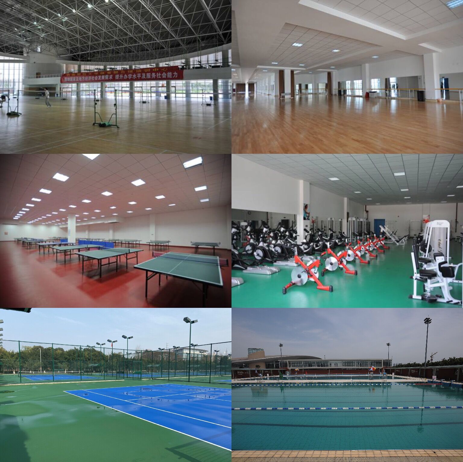 综合体育馆包括2片标准篮球场、羽毛球场、器械健身房、单车房、瑜伽室、乒乓球室、台球室、多功能形体室、学生体质健康测试室、运动人体科学实验室。馆内同时配备有LED大屏、音箱系统,是学校举办大型活动、大型赛事的重要场所。