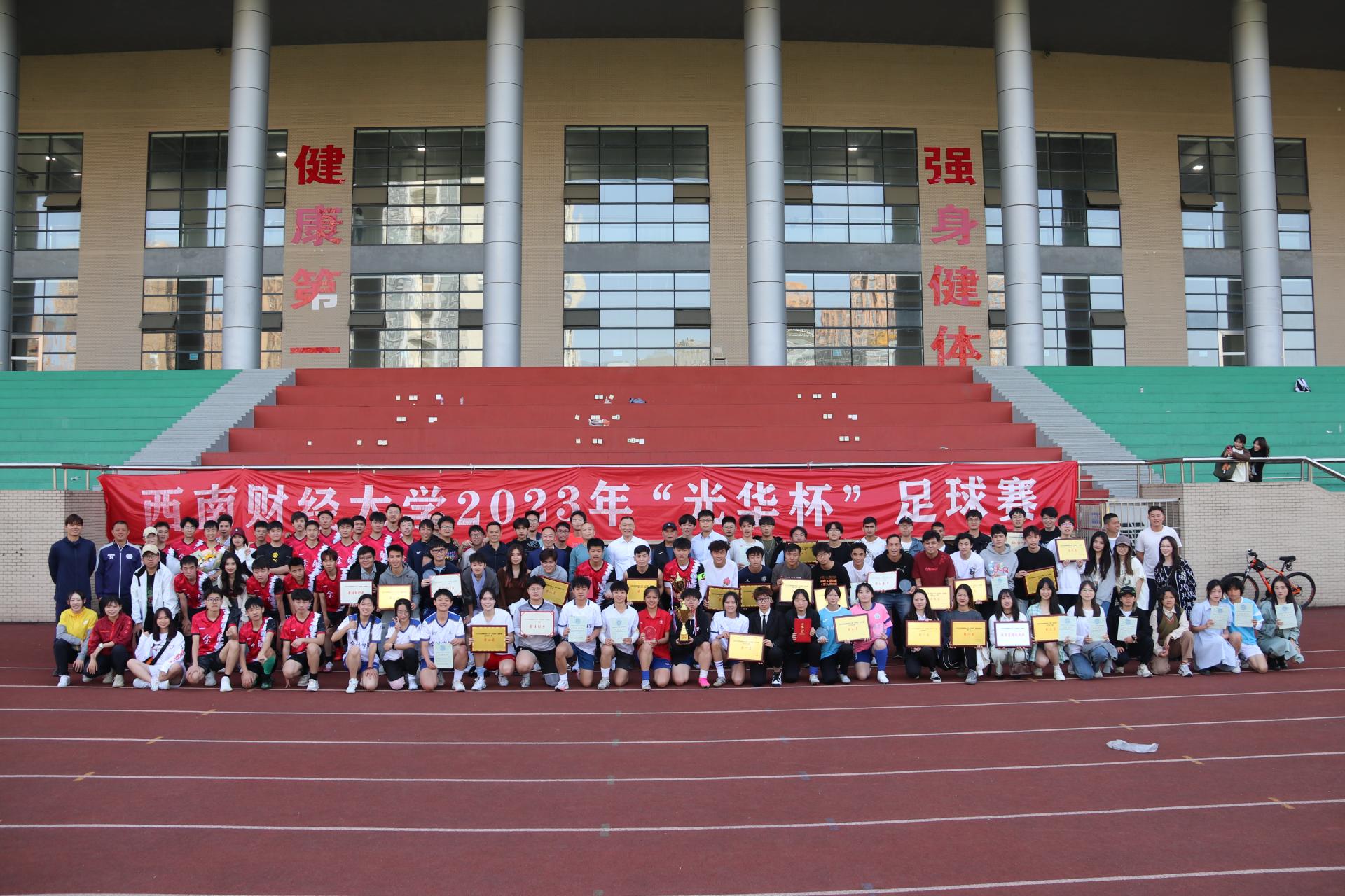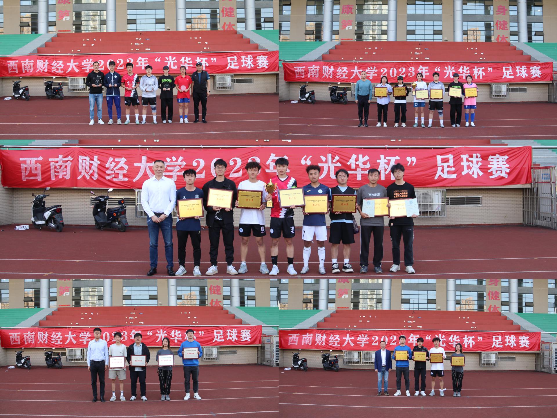 4月25日下午“礼赞新时代·奋进新征程,迎大运·迎百年校庆”2023年西南财经大学“光华杯”足球比赛颁奖仪式在晨曦足球场举行。好博在线院长杨远波,学院党委书记周正宏,副院长阴涛、陈丛刊,副书记李治为获奖学院以及个人颁发了荣誉证书及奖牌。