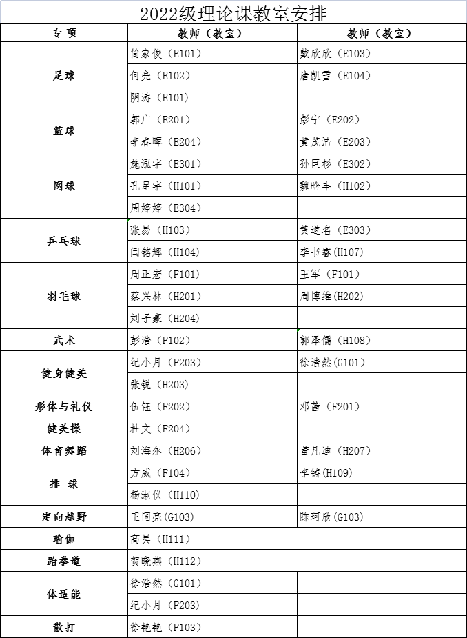 各学院: 经教务处同意,本学期2022级本科生第1周体育课为好博(中国)理论课,9月18日起恢复户外教学。根据教室资源状况,现将理论课具体安排通知如下: