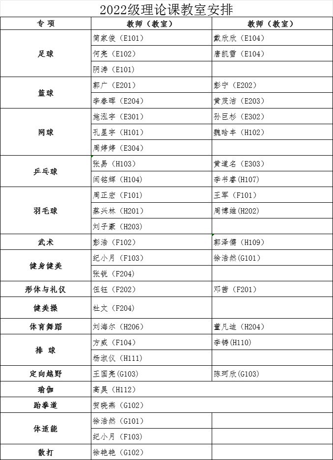 经教务处同意,本学期2022级、2023级本科生第1周体育课为好博(中国)理论课,3月4日起恢复户外教学。根据教室资源状况,现将理论课具体安排通知如下: