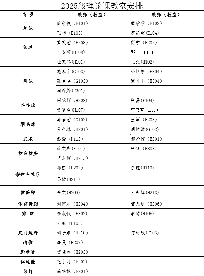 经教务处同意,本学期2025级本科生第3周体育课为好博(中国)理论课,9月28日起恢复户外教学。根据教室资源状况,现将理论课具体安排通知如下: